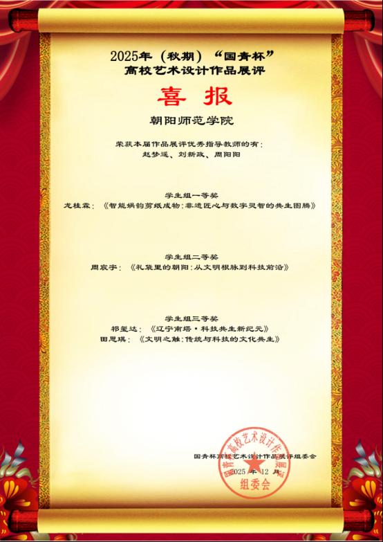 本次赛事中,赵梦遥、刘新政、周阳阳三位教师荣获“优秀指导教师”称号。学生组参赛作品同样表现亮眼:龙桂霖同学的《智能娲韵剪纸成物:非遗匠心与数字灵智的共生图腾》获学生组一等奖;周宸宇同学的《礼袋里的朝阳:从文明根脉到科技前沿》获学生组二等奖;祁玺达同学的《辽宁南塔·科技共生新纪元》、田思琪同学的《文明之触:传统与科技的文化共生》获学生组三等奖。学生作品紧扣时代议题,融合传统与科技,彰显扎实专业素养与创新思维。此次佳绩是学院“赛教融合”教学理念的生动实践,充分展现人才培养卓越成效。